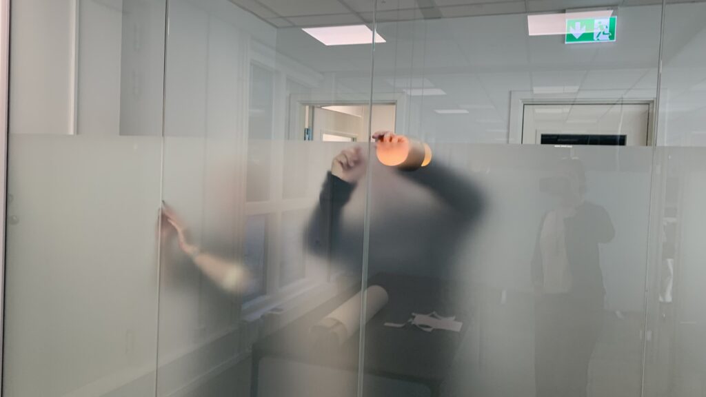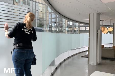I HV-Reklame har vi stor erfaring med at montere matteret folie på glasvægge og vinduer i alt fra mødelokaler og receptioner til åbne kontorlandskaber og butikker – også på de helt store glasfacader.